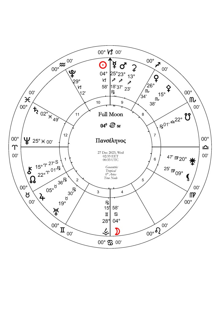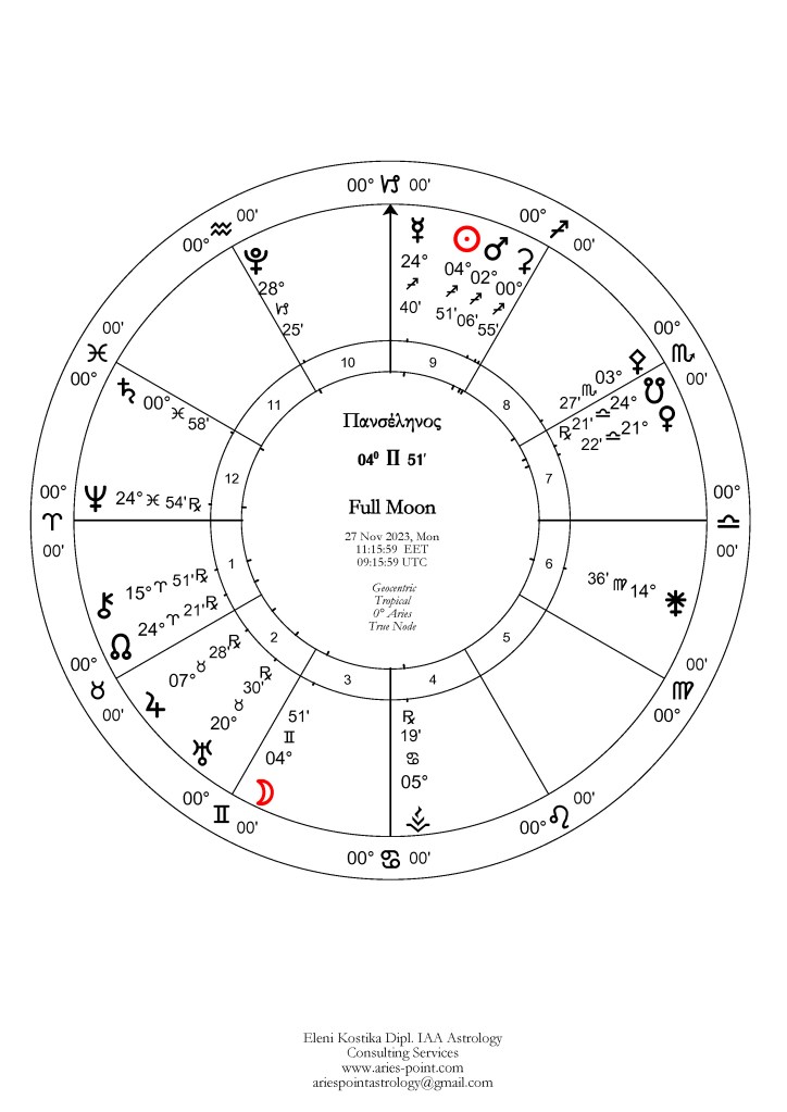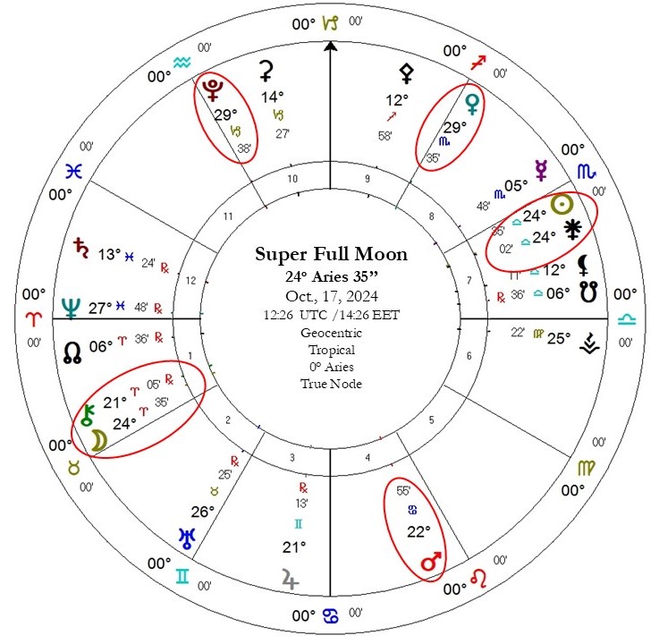 Οι κυβερνήτες των φώτων Άρης και Αφροδίτη έχουν περάσει μια ακολουθία φαινομενικής ανάδρομης πορείας, από τον περασμένο Δεκέμβριο μέχρι το δέυτερο δεκαήμερο του Φεβρουαρίου, και από τις αρχές Μαρτίου μέχρι την κορύφωση της Πανσελήνου αντίστοιχα. Διάστημα που τόνισε την ανάγκη επαναπροσδιορισμού στόχευσης, επένδυσης ενέργειας, σε σχέση με τις αξίες και τις σχέσεις στον κόσμο και στην ατομική μας ζωή. Την σχέση μεταξύ αυτονομίας και αμιβαιότητας ή συνεργασίας, την ατομική πρωτοβουλία και το αίσθημα δικαίου, σε κάθε συμμαχία, τον πόλεμο και την ειρήνη, αλλά και την οικονομία και τις αγορές, τα αποκτήματα, τα αγαθά και την διαχείρηση πόρων, στις διάφορες μορφές συμφωνιών και σύμβασεων που υφίστανται στον πλανήτη, και σχετίζονται με το διεθνές εμπόριο, και τις διεθνείς σχέσεις. Αυτά έχει γίνει μια πρσοπάθεια να κανονιστούν ή να μπούν νέοι κανόνες με το εξάγωνο Κρόνου/Ουρανού, σε συνεργασίες και δεσμεύσεις, τις δύο προηγούμενες εβδομάδες, ενώ στις ατομικές μας ζωές έδωσε την πτυχή της μεταρρύθμισης και της διόρθωσης θεμάτων είτε στον τρόπο που εργζόμαστε ή στις δομές που έχουμε συγκροτήσει. Έναν συνδυασμό του παλαιού και του καινούργιου. Η πανσέληνος εστιάζει σε σχέσεις, συμβάσεις, ισορροπία, διπλωματία, και γενικότερα την δίκαιη κατανομή πόρων και οικονομίας, στο άμεσο περιβάλλον μας, αλλά και στον κόσμο, καθώς διάφορες εστίες προβλημάτων θα επιχειρηθεί να συζητηθούν, να επιλυθούν, να διορθωθούν ή να προχωρήσουν σε μια πιο δυναμική περίοδο διαπραγματεύσεων. Ο χάρτης καταλήγει σε αμοιβαία υποδοχή του Δία στους Διδύμους και του Ερμή στους Ιχθυς, και αυτό εκδηλώνει πως η μεταβλητότητα, συνεχίζεται ως προς τις πληροφορίες, και τις διαπραγματεύσεις, τις εμπορικές συναλλαγές, ενώ το τρίγωνο του Δία με την Αθηνά Παλλάδα στον Υδροχόο, δίνει μια διέξοδο σε κινησεις με ευφυία και στρατηγική. Εναρμονίζει, την σοφία και τις γνώσεις μας, και στο πως αυτά μπορούν να εκδηλωθούν, αν αναπτυχθούν ή να συντονιστούν μέσα από συζητήσεις, επαφές και συναντήσεις με άλλους. Η αμοιβαία υποδοχή Δία και Ερμή, σε ζώδια εξορίας, δηλώνει πως τα δεδομένα, και οι πληροφορίες, που έχουμε στην διάθεσή μας, διακινούνται ευρύτερα και προοωθούν την επικοινωνία, ενώ η προοπτική, η αλήθεια, η αντίληψη και η κατανόηση των θεμάτων, δεν διακατέχονται ακόμη από σταθερότητα ως προς τα αποτελέσματά τους, αλλά χρειάζονται περαιτέρω διερεύνηση, διαπραγμάτευση και διευκρινίσεις, ως προς τις λεπτομέρειες.