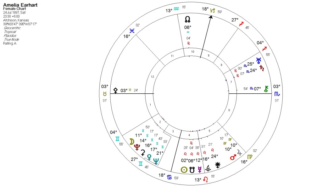 Από τα πολύ περίεργα μυστήρια η εξαφάνιση της πρωτοπόρου πιλότου Αμέλια Έρχαρτ. Διαβάζουμε πως ίσως βρέθηκαν συντρίμμια του αεροπλάνου της. Εξαφανίστηκε στις 2 Ιουλίου 1937. Το υποβρύχιο drone έκανε έρευνες μεταξύ Σεπτεμβρίου – Δεκεμβρίου 2023. Η Σεληνιακή Έκλειψη του περασμένου Οκτωβρίου είναι στην μοίρα του Ωροσκόπου της. Η μυστηριώδης εξαφάνιση της ίδιας φαίνεται από την σύνοδο Αφροδίτης – Ποσειδώνα στον χάρτη της, και με τους Ιχθείς στην ακμή του 12ου ο θαλάσσιος χώρος τονίζεται. Η Ηλιακή έκλειψη που έγινε ένα μήνα πριν την εξαφάνισή της (αναρτώ τον χάρτη) γίνεται στην γενέθλια σύνοδο Αφροδίτης-Ποσειδώνα). Ο 12ος οίκος κυβερνάται από τον Δία και τον Ποσειδώνα. Βλέπουμε τώρα το πλησίασμα της συνόδου transit Δία και Ουρανού στον 1ο οίκο. Τα αεροπλάνα κυβερνά ο Ουρανός. Βλέπουμε επίσης από πρόοδο τον Ήλιο σε έξάγωνο με τον προοδευμένο Δία, άλλο ένα χαρακτηριστικό της αλήθειας που έρχεται στο φώς για την εξαφάνισή της. Κατα την διάρκεια των πρόσφατων ερευνών ο Ερμής ήταν ανάδρομος στον Τοξότη, σχέση με το παρελθόν στον 8ο και 9ο οίκο του χάρτη της. Ας περιμένουμε την σύνοδο των δύο πλανητών στο τέλος Απριλίου ίσως έχουμε την αποκάλυψη. Πάρα πολύ ενδιαφέρουσα η ιστορία αυτής της θαραλλέας γυναίκας, και επίσης βλέπουμε πως ένας χάρτης αναδεικνύει γεγονότα προς έρευνα και μετά τον θάνατο. (Η αστρολογία είναι ένα πολύ χρήσιμο εργαλείο).