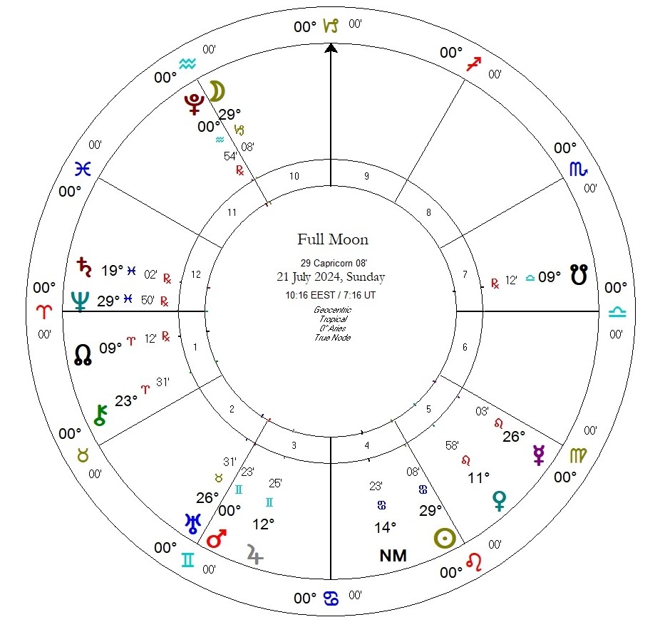 Τα στοιχεία και η μεγάλη εικόνα – Η Πανσέληνος της αναθεώρησης, της ανταλλαγής και διάδοσης, απόψεων και ιδεών, αλλά και της ανάγκης αποσυμφόρησης από πιέσεις, παρανοήσεις, σύγχυση και δυσκολίες. Η Πανσέληνος της μάθησης και της διαίσθησης, της επεξεργασίας, διερεύνησης πληροφορίας και γνώσης. Ανάγκη για επικοινωνία, επαφές, κοινωνικότητα και νέα ερεθίσματα, αλλά και εξερεύνησης εναλλακτικών κατευθύνσεων και πεδίων γνώσης. Τα Φώτα, μαζί με τον Άρη, αποκλίνουν από το τετράγωνο με τον Κρόνο στους Ιχθύς, και αυτό έχει μια χροιά απομάκρυνσης, απελευθέρωσης από κάτι έντονο και δύσκολο, ή και ολοκλήρωσης κάποιου έργου που προηγήθηκε, και που τώρα θα πρέπει να δούμε την απήχησή του. Παράλληλα, οι προηγούμενες μέρες τόνισαν ένταση, εκνευρισμό σε σχέση με προβλήματα ή επίλυση αυτών, που είτε μας έκαναν να αλλάξουμε την καθημερινότητά μας, απασχόλησαν τον νου ή τους τρόπους που επικοινωνούμε και λύνουμε προβλήματα. Ίσως το προηγούμενο διάστημα να ανέδειξε αδυναμίες να ανταποκριθούμε σε υποχρεώσεις ή πιέσεις σε σχέση με προγράμματα και προθεσμίες, που ζητούν τώρα ευελιξία και προσαρμογές. Επίσης, ίσως να έδειξε και μια τάση ή ανάγκη αναθεώρησης θεμάτων που μας έχουν περιορίσει, προκαλέσαν σύγχηση ή μας απασχόλησαν έντονα, όπου η Πανσέληνος αυτή και για τις επόμενες δύο εβδομάδες, θα μας δώσει την ευκαιρία να σχεδιάσουμε μια στροφή κατεύθυνσης, αλλά και να παρατηρήσουμε με άλλη ματιά ή από άλλη σκοπιά κάποια πράγματα. Οι πολλές γνώμες, σκέψεις και απόψεις θα συνεχίσουν είτε να μας αποπροσανατολίζουν, ή να μας φορτίζουν, αλλά μας καλούν να αντιληφθούμε πως χρειαζόμαστε κάποιου είδους ασπίδα προστασίας ή απόστασης. Αυτό θα τροφοδοτήσει τη δημιουργικότητα. Η ανάγκη να επικοινωνήσουμε και να επεξεργαστούμε δεδομένα ή να μοιραστούμε είναι περισσότερο έκδηλη σε σχέση με το προηγούμενο διάστημα που είχε πιο εσωστρεφή χαρακτήρα, ενώ έχει και έναν χαρακτήρα σταθεροποίησης του εσωτερικού μας νοήματος και εκτίμησης ενός δικού μας τρόπου και στάσης ή αντίστασης. Ποια είναι η αλήθεια του ‘μαζί’, της συνεργασίας και του μοιράσματος και πώς την καλλιεργούμε; Πού είμαστε ειλικρινείς και πού υποκρινόμαστε;