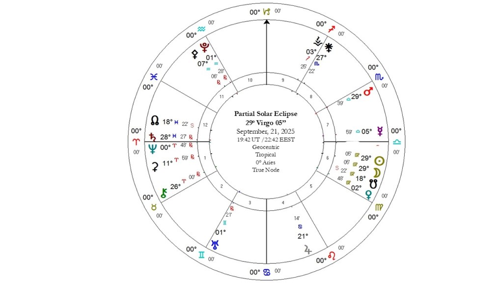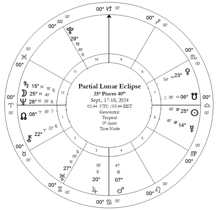 Σημειώνω επίσης πως οι Δεσμοί της Σελήνης ήταν στην αναιρετική μοίρα τον Ιανουάριο του 2025. Ο Κρόνος,έκανε την φαινομενική αναδρομή του στην αναιρετική Ιχθύων 2-3 Σεπτεμβρίου. Πιθανόν αυτή η έκλειψη να σχετίζεται με θέματα που ενεργοποιήθηκαν αυτές τις ημερομηνίες, αλλά και 18-19 χρόνια πριν.