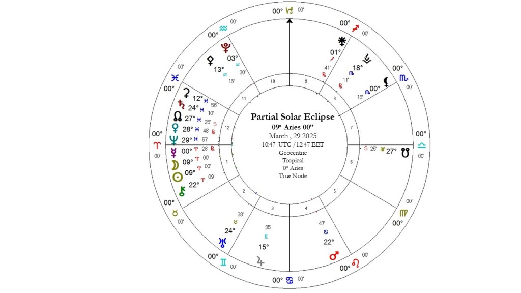 A Solar Eclipse is a more dynamic New Moon. It marks the beginning of new possibilities and the end of past issues, which open the way for something new or a different approach. In general, eclipses are phenomena that accelerate developments and push us towards changes, potentially affecting our psyche, physical or terrestrial conditions, environment, and habits. They may reveal our deeper needs for change, or external factors may push us toward them. Generally, Eclipses, accelerate events and are connected to events in the geopolitical landscape, geophysical or climatic phenomena. The Sun is connected to leaders or leadership, and all forms of authority in our lives. This is the last eclipse in the sign of Aries that have started the spring of 2024, and this one ocuurs with the Lunar Nodes on the Pisces/Virgo axis – a sector of life about purification, health, service, work, and contribution, as well as the relationship between faith and discernment, usefulness and ideals. Therefore, it calls us to take initiatives, but also urges us to see how we can make changes to correct issues, clarify situations from the past, reevaluate, reconnect, and review relationships, contacts, and plans related to the past, and create bridges for the future. Re-examine and re-think what serves the greater whole, or release what does not serve. We re-connect to the past. The element of courage and intuition are engaged in innovative or pioneering ways, take th less trodden path. This eclipse encourages us to strengthen or change our relationship with our physical self and the familiar or domestic environment of our lives, or our past self. In three, six, or nine months, the eclipse will manifest its full potential.