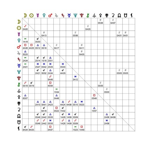Main aspects and configurations analysed: Cardinal T-square with Vesta at the apex. Venus square Uranus, Mercury opposite Neptune, Mars triggers eclipse degree, and conjunct South Node, Mars quincunx Uranus, Jupiter in quintile aspect with Saturn.