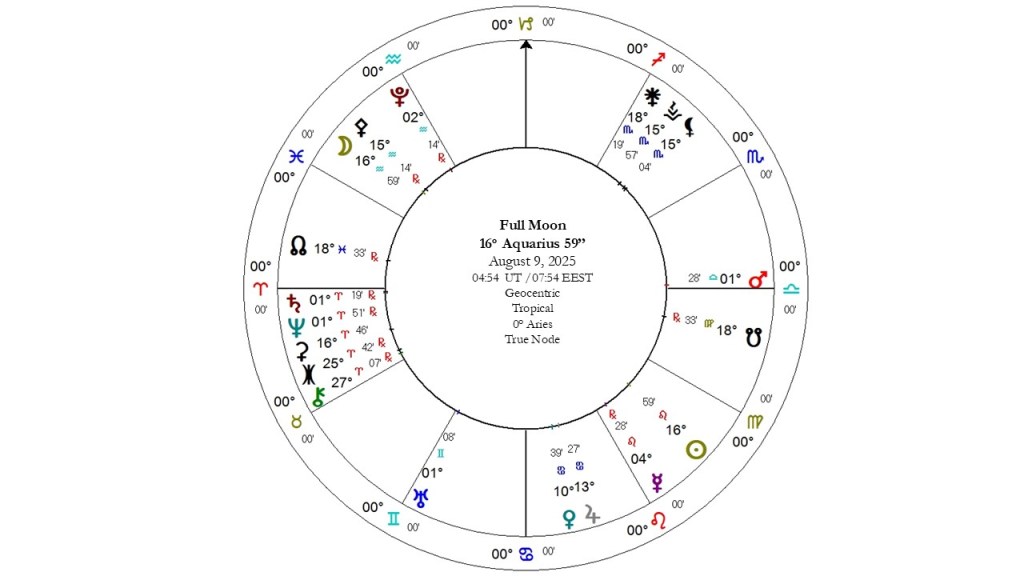 Η Πανσέληνος στον άξονα Λέοντα–Υδροχόου σηματοδοτεί την κορύφωση ενός έντονου πλουτώνιου σεληνιακού κύκλου που ξεκίνησε στις 24 Ιουλίου. Ο κύκλος αυτός ενεργοποιεί διαδικασίες βαθιάς ριζικής αναμόρφωσης: αλλαγή οπτικής, αντιμετώπιση φόβων, ανάδειξη χρόνιων θεμάτων που απαιτούν θεραπεία και εξυγίανση. Παράλληλα, αναδεικνύει την ατομική μας δύναμη, τον ρόλο που οικειοποιούμαστε ή αναλαμβάνουμε, θέματα ταυτότητας, ισχύος, ηγεσίας, ταλέντα, βούληση και το δημιουργικό μας έργο, καθώς και την ανάγκη αυτά να εκφραστούνμ και να επανατοποθετηθούν με νέο τρόπο στο κοινωνικό ή συλλογικό πλαίσιο, και στις σχέσεις μας με τους άλλους.