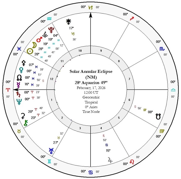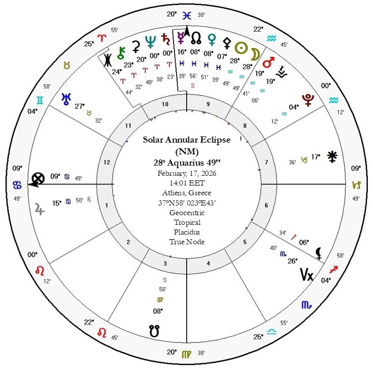 Η δακτυλιοειδής Ηλιακή Έκλειψη της 17ης Φεβρουαρίου 2026 στις 28°49′ Υδροχόου και η Σύνοδος Κρόνου–Ποσειδώνα στις 20 Φεβρουαρίου 2026 στην 0°45′ Κριού (1η μοίρα Κριού) ανοίγουν ένα νέο κεφάλαιο, όπου το παλιό και το νέο συνυπάρχουν. Οι γενιές συνυπάρχουν, όλα συναντιούνται ή συγχωνευονται μέσα απο ενα τέλος και μια καινούργια αρχή. Είναι μια στιγμή αποκάλυψης, ωρίμανσης, αποδοχής, μετάβασης, αλλά και εξάλειψης προκαταλήψεων.