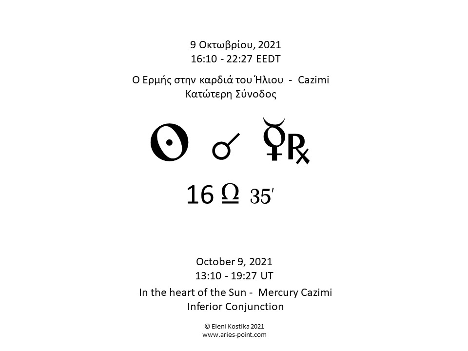 Ένας νέος κύκλος ξεκινά σε σχέση με την βούληση, τις επιθυμίες και το επιχειρείν σε κάποιο τομέα της ζωής μας. Πως επενδύουμε την ενέργειά μας σε σχέση με αποφάσεις και σκοπούς, μέσα απο το ζώδιο του Ζυγού αφορά τις σχέσεις και τις συνεργασίες. Μια περιστασιακή διάυγεια χαρακτηρίζει τις κινήσεις, δράσεις και επιθυμίες, όπως και πρωτοβουλίες, που μαζί με την Νέα Σελήνη τονίζει ξεκινήματα που θα συντονιστούν και με άλλους αλλά και πιθανόν με δημιουργικές κατευθύνσεις. Ό,τι και αν κάνουμε αυτές τις μέρες είναι σημαντικό να συντονιστούμε με το κέντρο μας, την καρδιά και να ενεργήσουμε με σκοπό το μοιρασμα και την αμοιβαιότητα. Η ενέργεια που επενδύουμε γονιμοποιεί στόχους και προθέσεις αλλά και σπόρους ιδεών, επαφών και επικοινωνίας μαζί με την κατωτερη σύνοδο Ήλιου – Ερμή που πραγματοποιείται στις 9 Οκτωβρίου που έχουν μακροπρόθεσμο χαρακτήρα. Ο κύκλος Ήλιου – Άρη ολοκληρώνεται στις 17 Νοεμβρίου 2023. Η διάυγεια αυτή θα είναι περιστασιακή καθώς το φαινόμενο cazimi κρατά περίπου 2 μέρες στην περίπτωση του Άρη, και κάποιες ώρες στην περίπτωση του Ερμή, ένας κύκλος κλείνει ένας νέος ξεκινά και μπορούμε εκμεταλλευτούμε την συγκυρία για να διακρίνουμε και να στοχεύσουμε, βοηθά επίσης την φυσική κατάσταση περιστασιακά να ανακάμψει και να βρει ισορροπίες. Η διπλωματική στάση θα βοηθήσει, ενώ πιθανόν να υπάρχει και τάση για διαφωνίες που χρειάζονται συμβιβασμούς ή μεταρρυθμίσεις. Το πως σχετιζόμαστε και ο τρόπος που παίρνουμε πρωτοβουλίες θα μας απασχολήσει κυρίως στις σχέσεις με τους άλλους καθώς ο Χείρωνας είναι απέναντι από τις συνόδους και ζητά εναλλακτικές οδούς και υπερβάσεις, αλλά και μας φέρνει σε επαφή με την ανάγκη να γεφυρώσουμε διαφορές. Η βασική πρόθεση του διετους κύκλου Ήλιου-Άρη είναι να βρούμε ή να αποκατασττήσουμε ισορροπίες στην ζωή μας. Η πρόθεση είναι να κάνουμε κινήσεις και να αντιληφθούμε με τι πρέπει να συμφιλιωθούμε και τι επίσης να κόψουμε για να επιτύχουμε περισσότερη αρμονία στην ζωή μας.