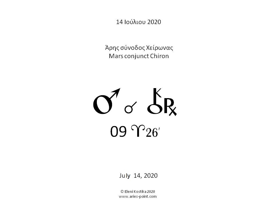 Ένας διετής κύκλος κλείνει, ένας νέος ανοίγει σήμερα. Είναι η πρώτη φορά που ο Άρης συναντά τον Χείρωνα στο ζώδιο του Κριού στην παρούσα διέλευση του. Η διέλευση του Χείρωνα στον Κριό διαρκεί 8 χρόνια (2018-2026). Η συνάντηση αυτή συμπίπτει και με την αντίθεση Ήλιου-Δία από τα ζώδια του Καρκίνου και του Αιγόκερου. Είναι η στιγμή που μας αποκαλύπτεται κάτι, και ταυτόχρονα συνειδητοποιούμε την σοφία της αυτόνομης ύπαρξης, θέσης και ματιάς μέσα από το ‘τραύμα’. Τι είναι ‘τραύμα’ και πως αντιλαμβανόμαστε την έννοια της τρωτής μας ύπαρξης, πως βιώνουμε τις αδυναμίες και ευαισθησίες μας, πως τις εκφράζουμε στους άλλους, πως το τραύμα ορίζει την διαφορετικότητά αλλά και μοναδικότητά μας, πως μας ωθεί να αντιλαμβανόμαστε την αυθεντικότητα της ύπαρξης μας, πως μας ευαισθητοποιεί σε σχέση με τον ζωτικό μας χώρο, αλλά και πως υπερασπιζόμαστε αυτόν τον ζωτικό χώρο την στιγμή που ανοίγει μια πληγή, πως μέσα από την αυτόνομη στάση μας και την ενεργοποίηση του θάρρους λειτουργούμε ως παράδειγμα ή βοηθώντας άλλους θεραπεύουμε κι εμάς; Στην συνάντηση του με τον Χείρωνα, ο Άρης ενεργοποιεί τον Χείρωνα ως χορηγός του από το ζώδιο που κυβερνά, κι έτσι μπορούμε να πούμε πως η σημερινή σύνοδος δίνει ένα σημαντικό στίγμα για το τι σημαίνει συλλογικά η διέλευση του Χειρωνα στον Κριό, στο συλλογικό κομμάτι της εμπειρίας. Ο Χείρωνας είναι ο πληγωμένος θεραπευτής, είναι η γεφυρα μεταξύ του Κρόνου και του Ουρανού, μέσα απο την μυθολογική διάσταση του Προμηθέα, μεταξύ της απτής πραγματικότητας και της προόδου, της πνευματικής διάστασης της αντίληψης του ανθρώπου. Άρα είναι ένα ουράνιο σώμα που μιλά για υπερβάσεις, για την εναλλακτική οδό αλλά και την διάσταση μιας θέσης στον κόσμο που λειτουργεί ως ‘γέφυρα’ και δεν ανήκει ή δεν ενσωματώνεται απαραίτητα κάπου. Ανήκει στον αυθεντικό εαυτό (Κριός έξαρση του Ήλιου), και αυτό εμπεριέχει το ηρωικό στοιχείο. Το αρχέτυπο του ήρωα που δεν είναι αυτό του Ήλιου, της υπεροχής, αλλά εκείνο που έχοντας αποδεχτεί τις αδυναμίες του διαπιστώνει πως το τραύμα είναι δώρο και μπορεί μέσω αυτού να ευεργετήσει άλλους. Ο Χείρωνας μιλάει για της ‘πληγές’ μας και την σοφία που αποκομίζουμε από αυτές. Μιλά επίσης για την ‘αποξένωση’ που δημιουργεί την οδό της γνώσης. Ο Χείρωνας -κένταυρος είναι η μετουσίωση του φυσικού/σωματικού/υλικού πεδίου με το πνευματικό. Ο Χείρωνας έχει μόλις ξεκινήσει την ανάδρομη πορεία του, και ο Άρης βρίσκεται στο ζώδιο της κυριαρχίας του. Κάτι ξύνει μια πληγη υπαρξιακής φύσης ή για να την συνειδητοποιήσουμε ή για να την θεραπεύσουμε, κάτι παραβίαζει τον ζωτικό μας χώρο ή κάτι ενεργοποιεί έναν τρόπο να δράσουμε εναλλακτικά και παράλληλα να ξεκινήσουμε μια θεραπεία και εντός μας. Ο Άρης έχει σχέση με τα ξεκινήματα και τις ενάρξεις, και είναι σήμερα που ξεκινάει μια διαδικασία διετής, με τόλμη και θάρρος, που συλλογικά μιλά για την αποδοχή των αδυναμιών, και την διάνοιξη οδών μέσα από πρωτοβουλίες, του τρόπου να χτίσουμε γέφυρες για αποφάσεις και συμφωνίες ανάπτυξης (Ήλιος αντίθεση Δίας) χωρίς να χαθεί η αυτονομία. Σε ατομικό επίπεδο, η διεργασία αυτή έχει σχέση με τον γενέθλιο Χείρωνα και Άρη, και την οικοθεσία του στον χάρτη, και ίσως είναι χρήσιμο να ανατρέξουμε στην αρχή του κύκλου που κλείνει σήμερα που έγινε στις 29 Δεκεμβρίου του 2018 στις 28 μοίρες Ιχθύων και να στοχαστούμε που βρισκόμαστε σε σχέση με την παρα